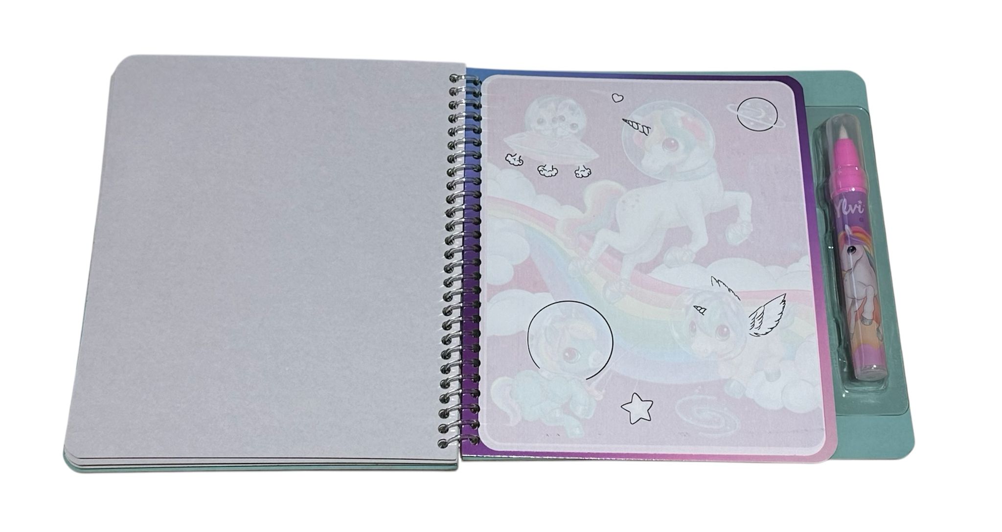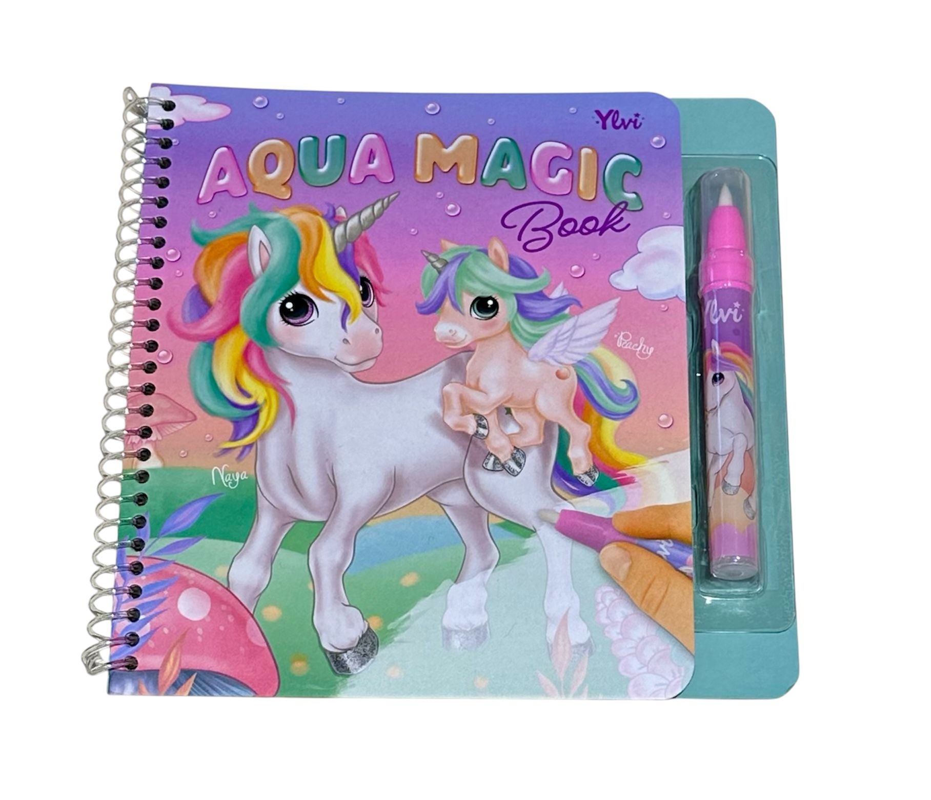 Quando si passa con la penna ad acqua (ricaricabile) sulle pagine bianche del libro magico appaiono magicamente delle immagini meravigliose e colorate. Una volta asciutta la carta, le immagini scompaiono e sono pronte per essere nuovamente “colorate” con la penna ad acqua. Le pagine rilegate a spirale sono realizzate in cartone molto rigido, il che impedisce loro di inzupparsi.