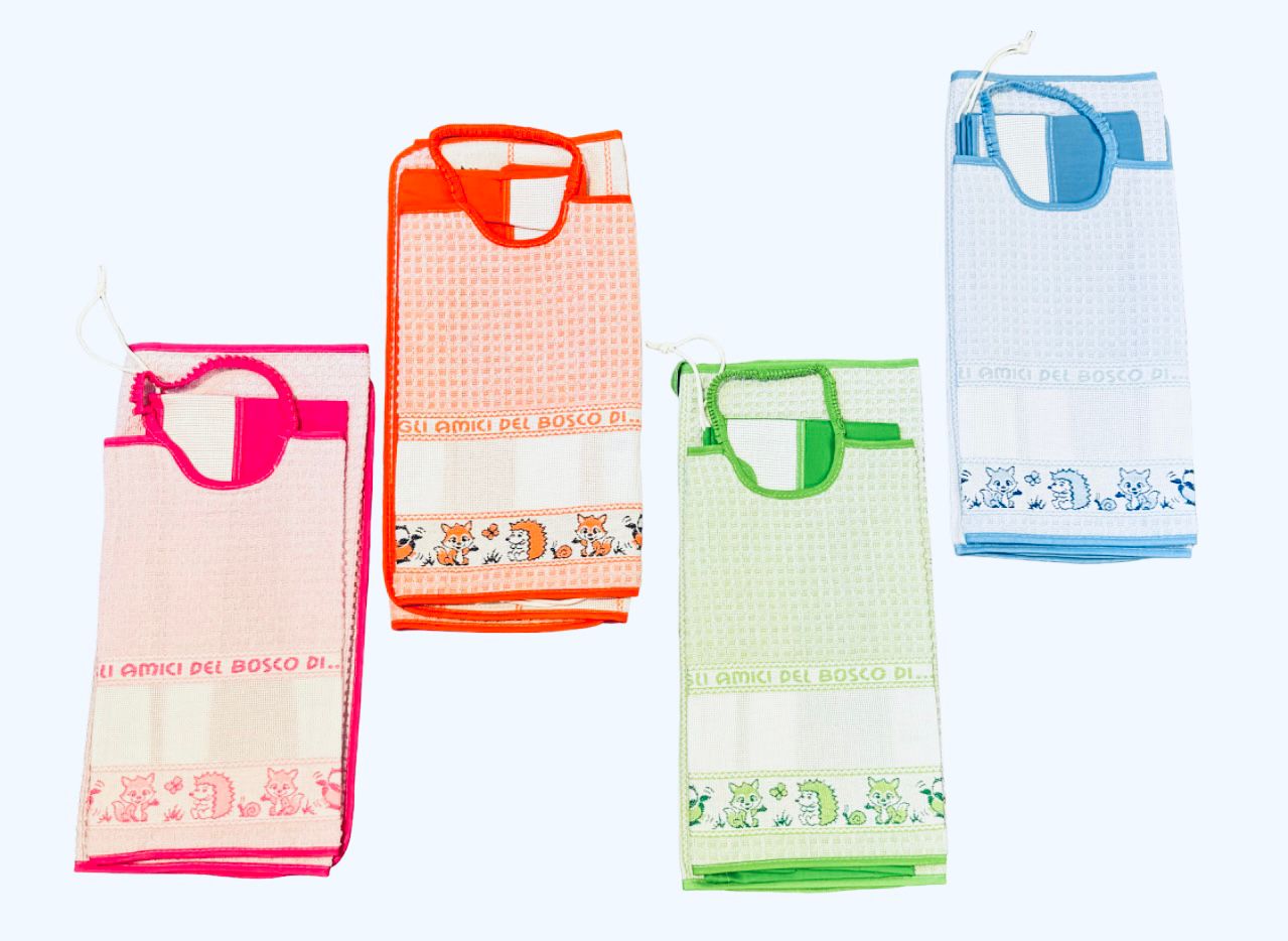 SET ASILO amici del bosco, 100% COTONE con inserti dove poter ricamare o scrivere il nome. Il trio pack e’ composto da: BAVAGLINO allacciatura con elastico, misura cm. 28×33 cm – ASCIUGAMANO con anello per appenderlo cm. 40×55 cm e SACCHETTO in tela 34×38 cm.