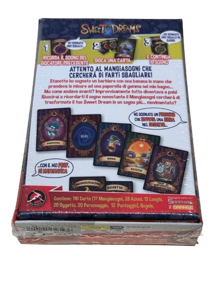 Stanotte ho sognato un barbiere con una banana in mano che prendeva le misure ad una Paperella di gomma nel mio bagno… Ma com’è andava avanti? Improvvisamente tutto diventava a pois! Riuscirai ricordarti il sogno nonostante il mangiasogni cercherà di trasformare il tuo Sweet Dreams in un sogno più movimentato? Divertimento assicurato per tutti con questo gioco. Consigliato dai 7 anni.