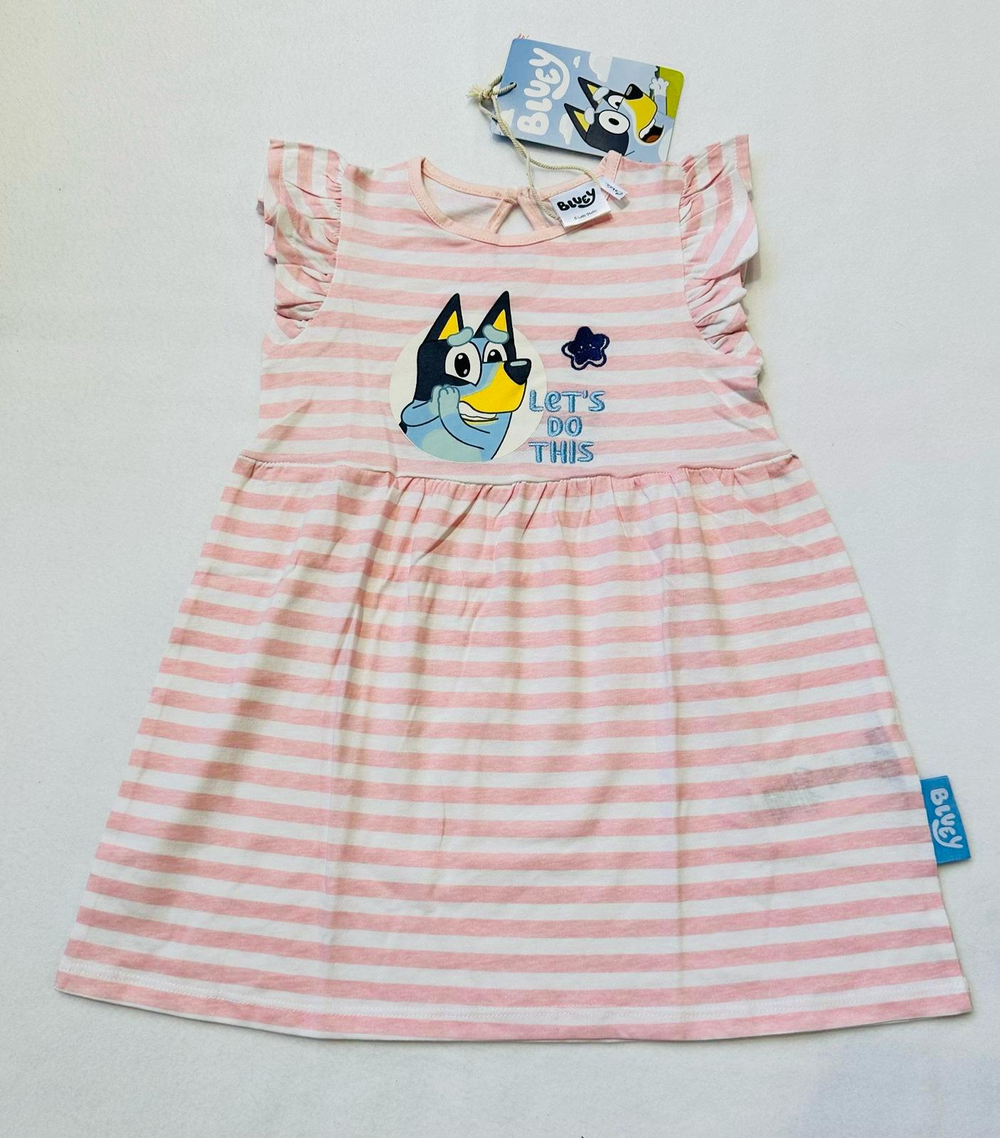Dolcissimo vestito di Bluey con scritta ricamata.